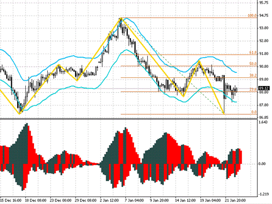 美元兑日元昨天在来回拉锯中重心略有下移,目前在89.00附近波动。4小时图来看汇价之前下探到08年12月17日的低点时获得了良好的支撑,短线的下跌动力开始衰退,预示着接下来将组织一波反弹行情。美元兑日元今天主要支撑在88.70,更大的支撑在88.10;主要压力位在89.30,更大的压力在90.00。