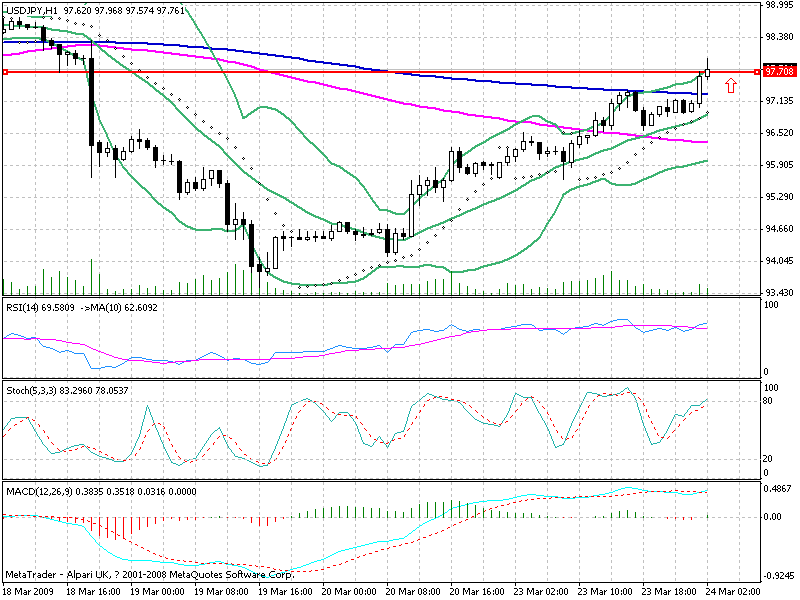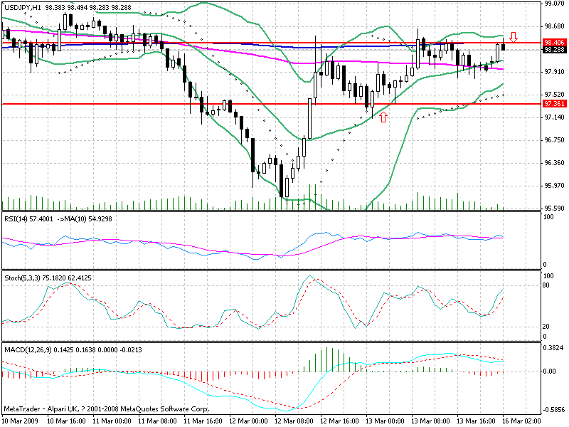 小时图中可以看到100小时与200小时均线均出现缓慢上行的态势。汇价短线支撑位于200小时均线,阻力则位于98.30-40。