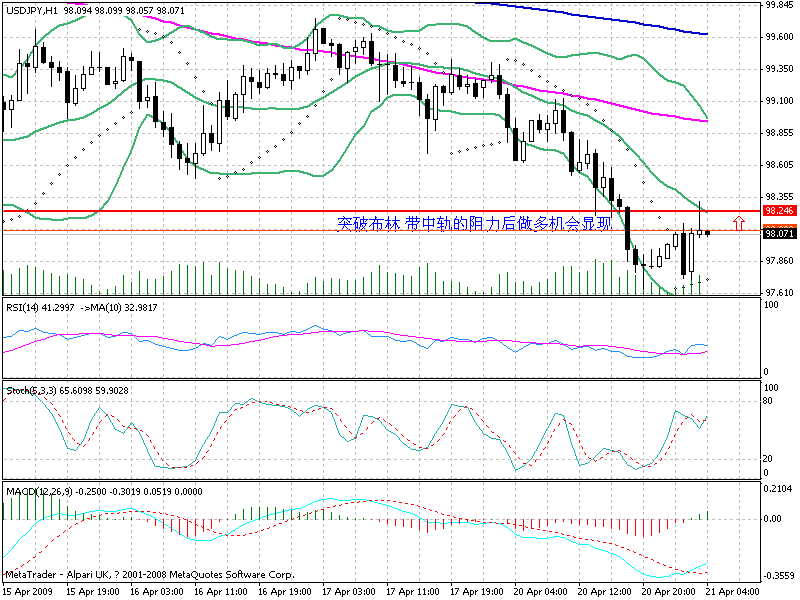 与欧罗的走势如出一辙,美日开盘即可出现弱势下行态势,跌破98平头后在97.70附近得到支撑。来到今日早盘,美日在不断的思考是否进行反弹还是继续下落。小时线布林带中轨的阻力还是比较明见可晰。但是美日向来“妖性”。weakyforex个人观点还是以振荡上行为主。