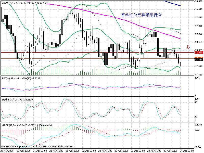 美日早盘延续前一交易日尾盘的趋势继续下行,最低点来到昨日的预期收益位97.70下方。盘中一度回头,来到小时线布林带中轨一线,之后继续盘整。从目前的走势来看,离100越行越远,短线汇价向下将成为主题。目前早盘在97.70-97.60附近游移,此区间为之前多日低点所在,可关注其支撑力度是否有效。
