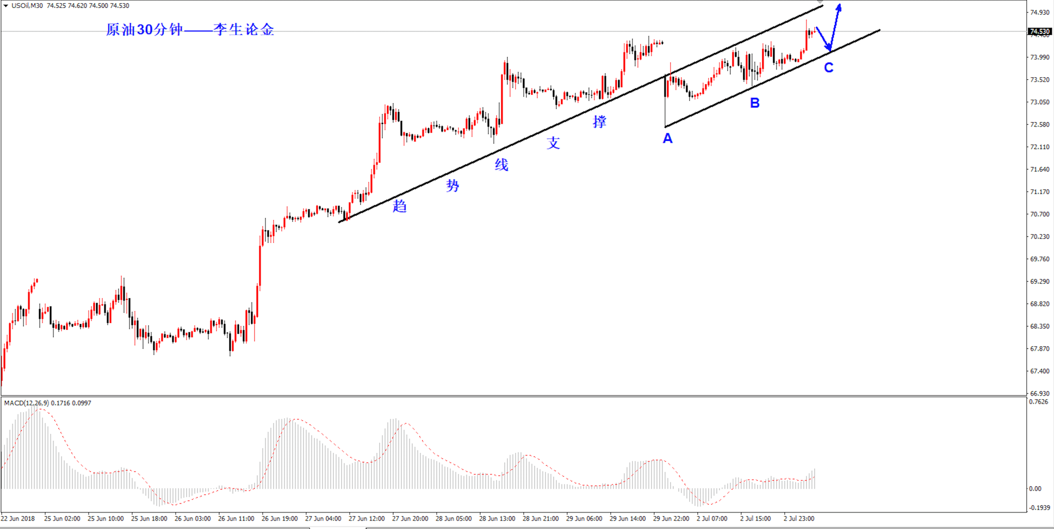 原油,因受特朗普周末爆出的言论的影响,周一,油价开盘大跌。低开低走测试72.80/72.90区间,震荡上行测试到74.20一线,冲高回落后测试趋势线,延续中长线周期的强势走势,微跌后震荡反弹的走势较为明显。切记盲目高位追多,可待回调趋势线后,找低点布局进场。强势当中的油价一直从上周开始,未有明显的走弱,尽量要规避一些所谓的中线布局想法,目前的原油没有这样的迹象,不要操之过急。