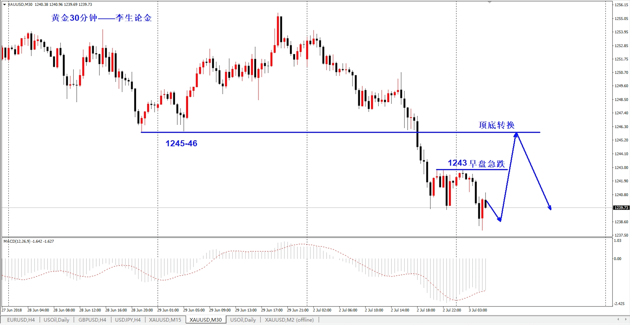 今天,早盘急跌无‘好事’,以1243为起跌点,跌至1238附近,上一次也出现过类似的行情,1259的下跌欧盘没有延续,反而再次试探到1259一线,这一次也一样,1243的得失,将决定着今天行情的方向,急跌的行情未必是真正的跌,除非美盘前1243没有破位,届时再顺势布局空单即可。