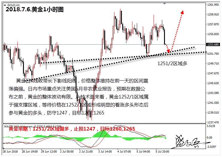 黄金策略:1251/2区域做多,止损1247,目标1260,1265