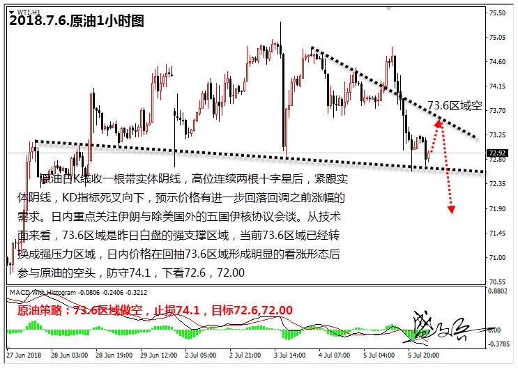 原油策略:73.6区域做空,止损74.1,目标72.6,72.00