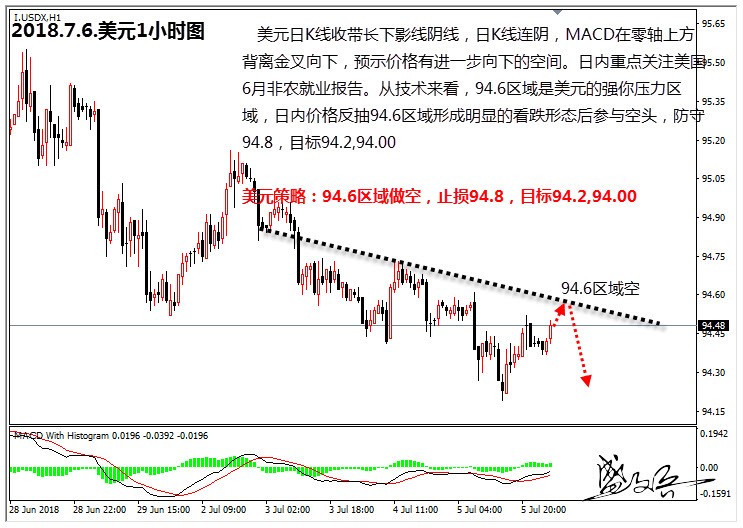 7月5日(周四)美元触底回升,最低94.17,收报于94.39,微跌0.16%。美联储6月会议纪要公布,纪要显示,美国经济强劲重申渐进加息,委员们越发担心贸易风险,提及新兴市场和欧洲动荡,监控收益美债率曲线。总体而言,纪要还是延续了六月会议以来的鹰派季调。数据公布后美元表现平淡。另外,之前美国6月ADP就业人数17.7万人,不及市场预期;但是6月ISM非制造业指数59.1,创四个月新高,表明服务业扩张势头稳健。ISM非制造业数据和之前公布的制造业数据一道,共同给出了美国经济在二季度稳健增长的信号。支撑美元反弹回来。日内美国6月非农就业报告将出炉,以及美国将宣布对中国加征关税进口商品清单等事件值得投资者密切关注。   美元日K线收带长下影线阴线,日K线连阴,MACD在零轴上方背离金叉向下,预示价格有进一步向下的空间。日内重点关注美国6月非农就业报告。从技术来看,94.6区域是美元的强你压力区域,日内价格反抽94.6区域形成明显的看跌形态后参与空头,防守94.8,目标94.2,94.00