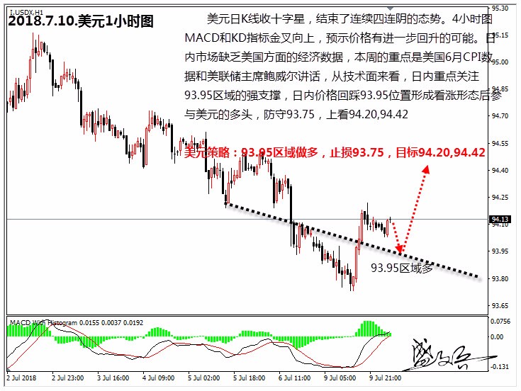 美元策略:93.95区域做多,止损93.75,目标94.20,94.42