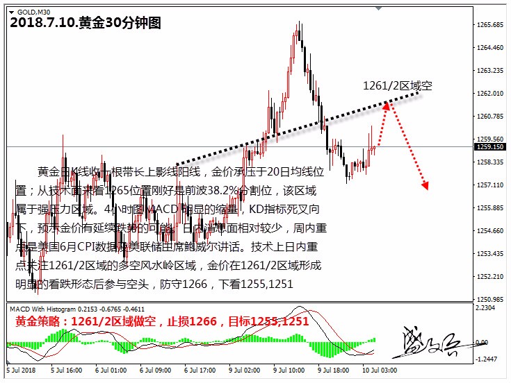 7月9日(周一)黄金冲高回落,最高触及1265.9,收报于1257.6,涨幅0.24%;白盘时间市场风险情绪好转,亚股和欧股全面上扬,欧系货币走强,美元指数承压回落,支撑黄金震荡走强,最高触及1265.9;但是美盘时段,美股大涨,提振美元指数转强,对黄金形成抑制。黄金震荡回落,最终收报于1257.6。昨日自消息面相对平淡。本周美国6月CPI数据和美联储主席鲍威尔讲话将对黄金产生重大影响。另外,本周即将召开的北大西洋公约组织会议,会对美元及黄金造成影响。特朗普以及他可能在北约会议上做出的意外活动,会让金融市场感到紧张。