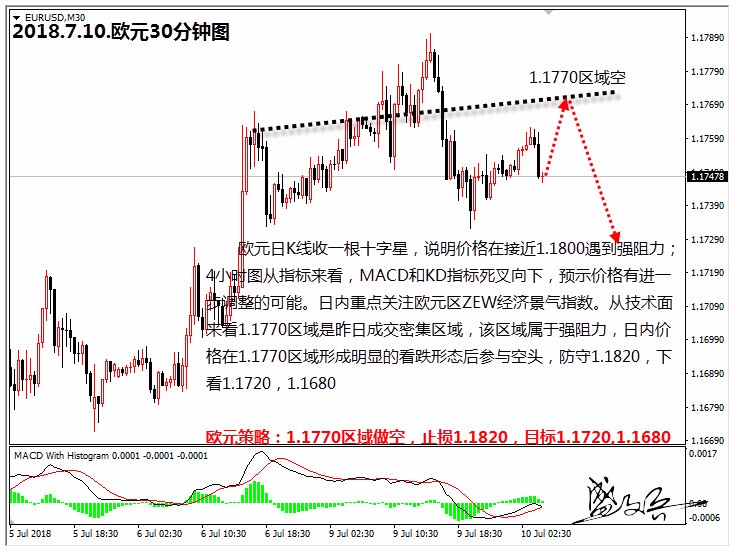 7月9日(周一)欧元冲高回落,最高触及1.1791,收报于1.1750,微涨0.05%。欧元区7月Sentixt投资者信心指数录得12.1,好于市场预期。终结连续五连跌的态势。欧洲央行管委诺沃特尼称,物价稳定意味着通胀率中期内接近2%。由于油价走高,欧元区通胀率肯能短暂高于2%;诺沃特尼的讲话提振欧元震荡走高。但是欧洲央行行长德拉基表示,贸易环境有风险,但通胀改善可持续,欧洲央行将逐步撤出宽松。贸易风险的加剧,可能导致欧元区经济增长缓慢或者滞涨,欧元承压回落。最终收报于1.1750.日内欧元区将公布ZEW经济景气指数数据,投资者重点关注。欧元日K线收一根十字星,说明价格在接近1.1800遇到强阻力;4小时图从指标来看,MACD和KD指标死叉向下,预示价格有进一步调整的可能。日内重点关注欧元区ZEW经济景气指数。从技术面来看1.1770区域是昨日成交密集区域,该区域属于强阻力,日内价格在1.1770区域形成明显的看跌形态后参与空头,防守1.1820,下看1.1720,1.1680