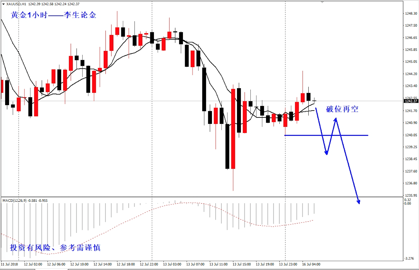 所以,早间稳健的朋友,可以暂时先观望,亚欧盘延续反弹,并且突破前高点,美盘则有机会入场做多,反之,1239-40的位置失守了,黄金则要考虑做反弹的空单,像上周五1245-46的点破位是一个道理,上周五1245破位之后,反弹迎来了一轮近10美金的下跌,这一次,也是关注1240这个位置的得失。