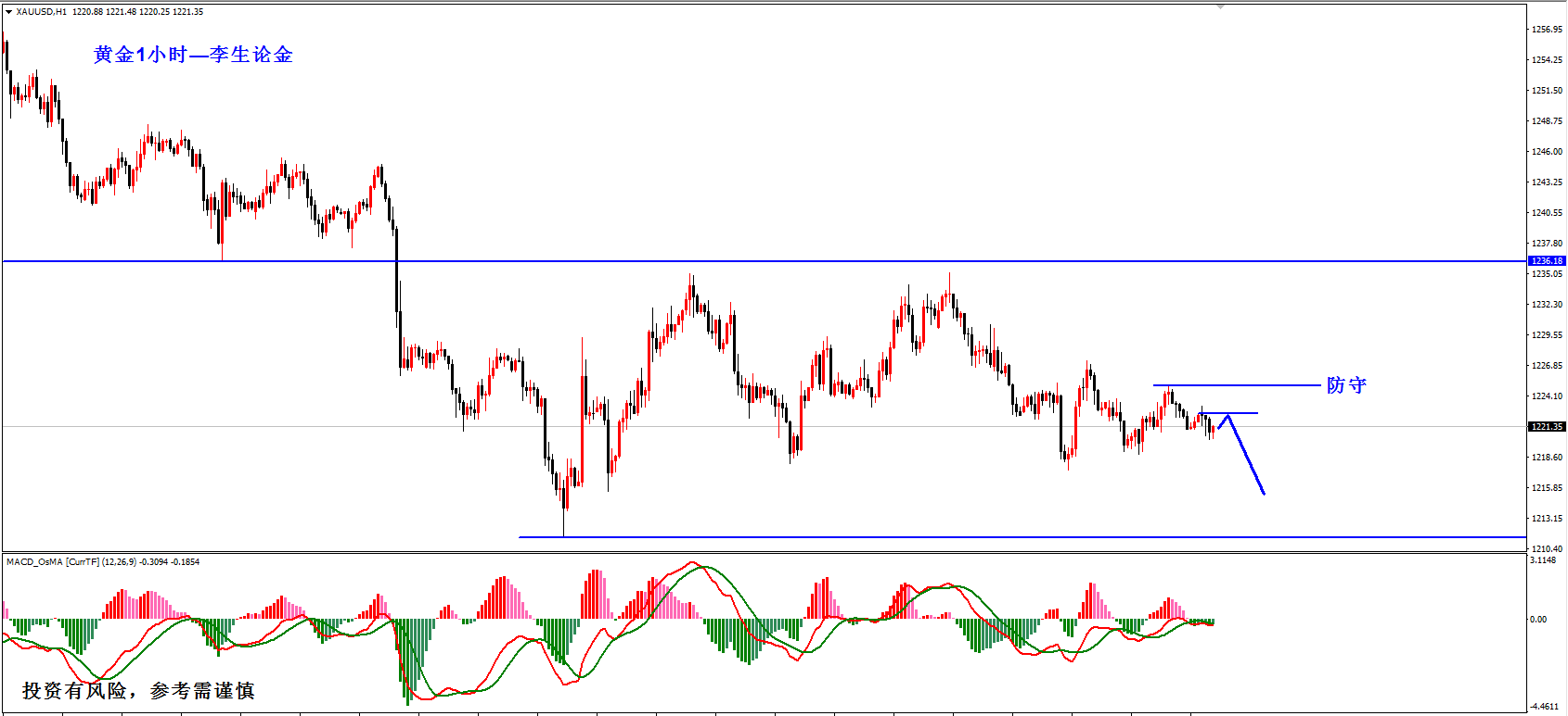 昨天,黄金的走势和分析写的基本一致,早盘再次试探1218的支撑不破后,开始反弹向上,不过美盘最高也就触及1225一线,反弹的动能不强,全天的波动也仅仅只有5-6美金。