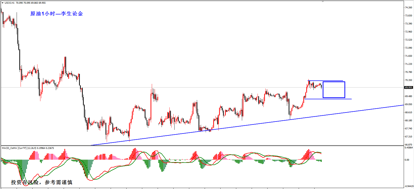 油价,昨天的走势如分析中的一致,早间自68.7-68.8直接展开反弹,最高涨至70.4的位置,原油近期的走势一直处于一个低点逐步抬高的过程之中,但是上涨的延续性却不强,每次在突破后都伴随着较大的回落和震荡,所以在操作上要避免去追多单,而应该在回落后在去入场,今天预计将会在70.3-69.3这个范围内先走震荡,可以以区间操作来对待,下方69.3做多,损68.7,目标70.3;上方70.3做空,损70.9,目标69.3。