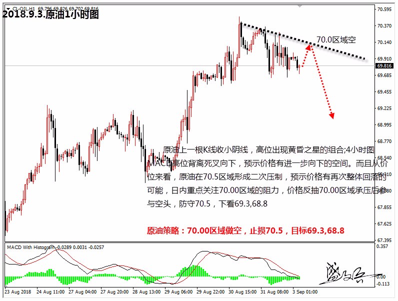黄金上根K线收带长上影线阳线十字星,今日开盘金价直接跌破1200关口。日图KD指标死叉向下;4小时图金价回落到均线系统下方,KD指标死叉向下,MACD在发生向下发展,预示价格有进一步现行的空间。日内重点关注1202/3区域的阻力,金价反抽1202/3区域承压后参与空头,防守1208,下看1195,1192 黄金策略:1202/3区域做空,止损1208,目标1195,1192 白银策略:14.55区域做空,止损14.75,目标14.30,14.00 原油 9月3日(周一)原油开盘后震荡走低,目前报价于69.81.上周五(8月31日)美加贸易谈判破裂,以及有消息称,特朗普将在本周公开评论期结束后,立即对2000亿输美的中国进口商品征收关税。使得贸易风险情绪回升,使得担忧贸摩擦的加剧将进一步影响到市场对于原油的需求。 另外,伊朗克石油部表示,伊朗克8月出口石油358.3万桶/日(总共出口1.1106亿桶),7月出口354.3万桶/日。据美国油服贝克休市的数据显示,美国8月31日当周石油钻井数增加2台,至862台;天然气钻井数增加2台,至184台;总钻井数增加4台至1048台。 根据美国能源信息署(EIA)数据显现,美国6月石油产出环比增长23.1万桶/日,增幅2.2%至1067.4万桶/日;5月产出上修0.1万桶/日,至1044.3万桶/日;美国6月汽油需求同比增长0.4%,至980万桶/日;5月需求未955万桶/日。美国6月石油产出创历史新高。