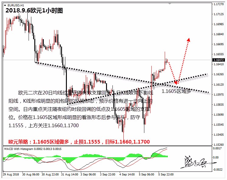 美元日K线收一个实体阴线,价格承压20日均线位置,K线形成明显的阴包阳的看跌形态。预示价格有进一步回落的空间。日内重点关注隔夜纽约时段反弹的高点95.3区域的阻力位置,价格反抽95.3区域形成明显的看看跌形态后参与空头,防守95.5,下看94.9,94.7 美元策略:95.3区域做空,止损95.5,目标94.9,94.7 欧元 9月5日(周三)欧元二次筑底成功回升,最低1.1542,收报于1.1631,涨幅0.41%。意大利总理萨尔维尼表示,意大利预算不会违反欧盟规则。据意大利媒体报道,萨尔维尼计划向欧盟和市场上严肃的遇上算方案。使得之前投资者担忧意大利预算可能超出欧盟限制的担忧解除。