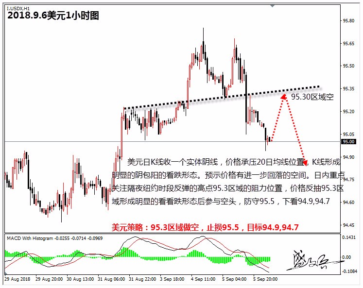 原油日K线收阴线,连续两连阴,价格接近40日均线的支撑位置。从价位来看,原油68.2/3区域是前期上涨的二次回踩横盘震荡区域的低点,日内重点关注68.2/3区域的强支撑,价格回踩68.2/3区域形成明显的看涨形态后参与原油的多头,防守67.7,上看69.00,69.5 原油策略:68.2/3区域做多,防守67.7,目标69.00,69.5 美元 9月5日(周三)美元冲高回落走低,最高95.67,收报于95.13,跌幅0.31%。美元盘中一度由于南非兰特的暴跌使得避险情绪回升,推升美元指数大幅的走高,但是美国公布的7月贸易帐不及市场预期。以及美联储官员发表鸽派言论承压美元最终收低。
