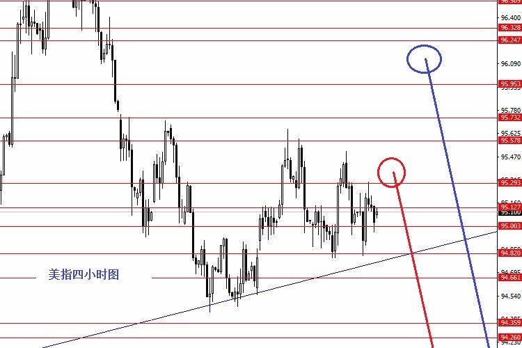 美指周初仍在小的区间内震荡,未来后市就两种,一种在95.70-94.60区间震荡盘整到时机后直接向下破位,运行中线下跌波段,另一种在周四晚盘前94.60一直没下破,并向上测试95.95/96.30区域后,再拐头向下大跌,目前来看,前者概率相对较大些。波段操作建议:95.50和96.20区域分批进场做空美指,止损96.85,目标看向92.80和92.60区域。控制仓量,严格止损。