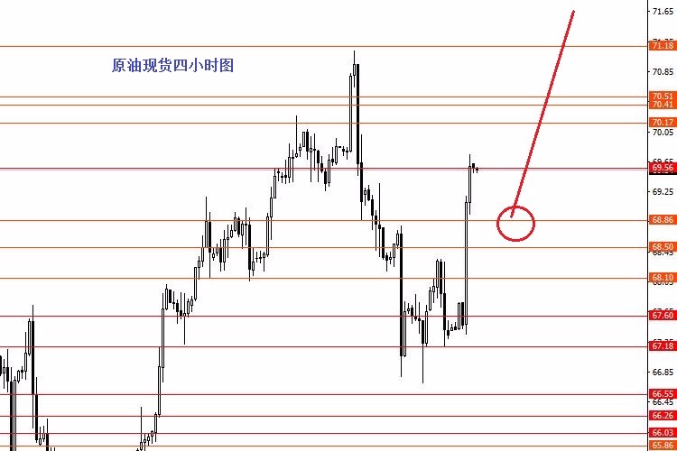 原油昨日直接上行,并未测试至66.00区域。从图形来看,节奏上后市还要继续看涨,因低点没有测试66.00区域,所以这波向上行情成功上破70.20的概率相对较大,后市按震荡向上格局运行。前期高点72.70区域不上去的概率大,所以波段向上后还会再次承压向下运行,长线目前就是大的区间震荡格局。今日操作建议:68.60区域做多原油,止损67.50,目标看向70.50和71.70区域。控制仓量,严格止损。