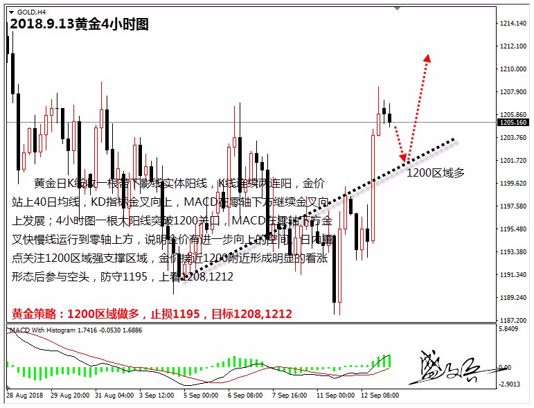 9月12日(周三)黄金多头大反攻,金价站上1200上方,最高1208.5,收报于1206,上涨7.6美元,涨幅0.63%。
