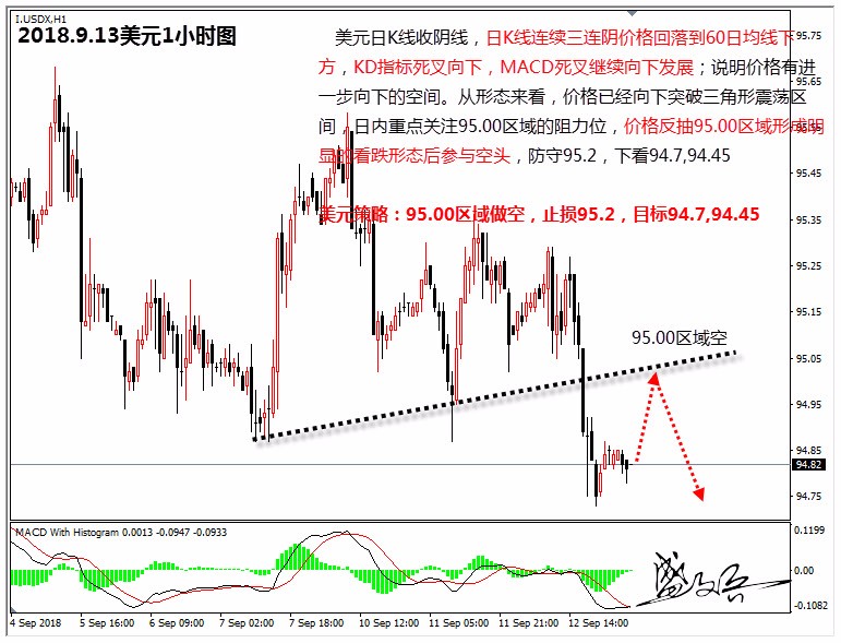 美元策略:95.00区域做空,止损95.2,目标94.7,94.45