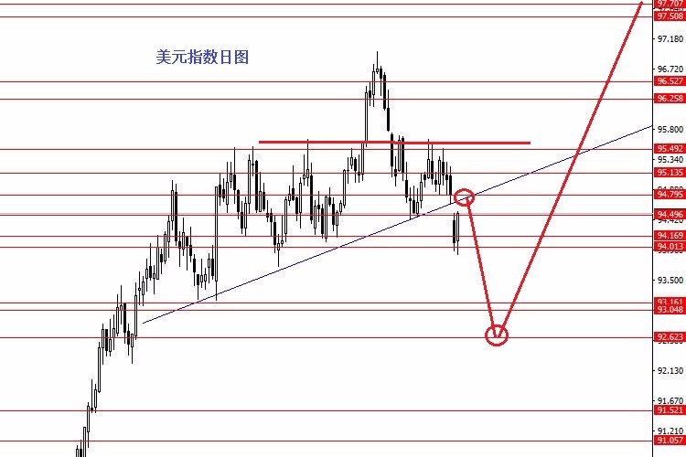 美指周五把周四跌幅全部收回,周图收阴柱。从图形来看,美指跌势依旧,本周关注上方94.80区域强阻力,在没成功上破前,继续看空美指,波段目标92.80/92.60不变,若成功站稳95.30上方后,则向上测试95.95区域的概率将加大,但中线主方向依旧为空,中线区域即使不再下跌也会形成大的高位区间震荡,目前再次拉涨的概率偏小。本周操作建议:94.80区域做空,止损95.50,目标看向92.80/92.60区域。控制仓量,严格止损。