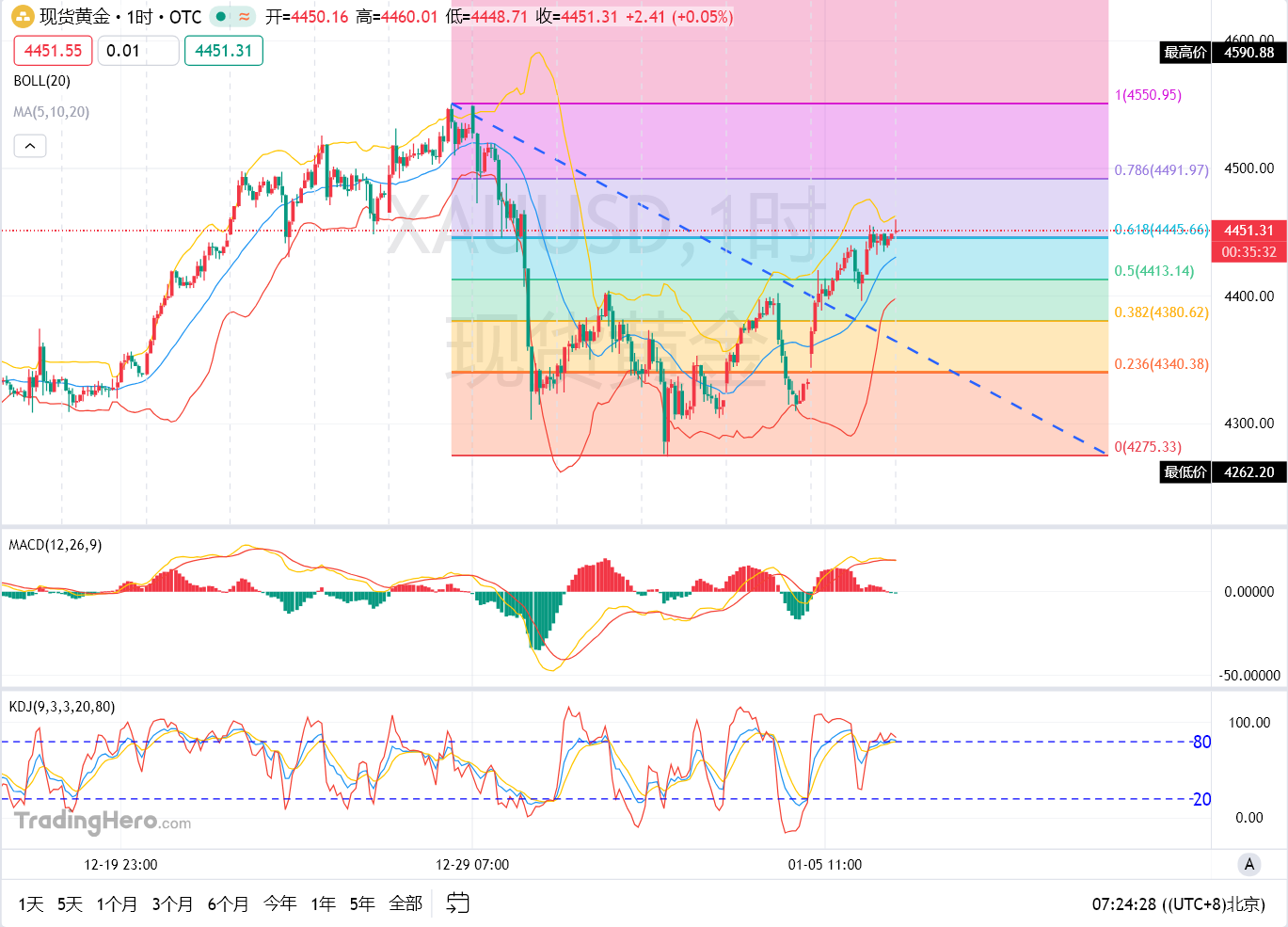 昨日受地缘性影响,委内瑞拉事件持续发酵黄金延续多头行情高开高走,一方面黄金本身存在避险属性,全世界经济环境压力剧增,各国央行大范围囤积黄金,使得金价持续拉升;另一方面,老美依旧还是世界经济霸主的地位,近期美元持续走弱,也使得黄金价值进一步升高,而本月美联储将换帅以及美联储已经确定2026年的降息预期持续推动金价上涨。 基本面 黄金昨日高开高走延续上行大趋势,亚盘开盘强势拉升,午后欧盘延续亚盘上升趋势后小幅回踩,晚间美盘多头再次主导行情走势,日内最高金价报4455美元/盎司,最低4345美元/盎司,收于4448美元/盎司,日内波幅达110美金,日线级别再次收出大阳线! 技术面 小时线级别上看,MACD多头持续放量,KDJ三线向上运行,BOLL开口向上且金价运行于中轨上方受中轨支撑。另外昨日金价突破4549—4274区间黄金分割线0.5一线压制,一般来说黄金突破这一线压制后还会有一部分上行区间,而下一关注点则需看到0.78压力即整数关口4500的压力位置,同时这个位置目前来看也有不错的支撑压力,个人认为日内延续做多机会是非常不错的。 操作建议:黄金现价4451可以轻仓尝试追多,目标上看4490止损放4435