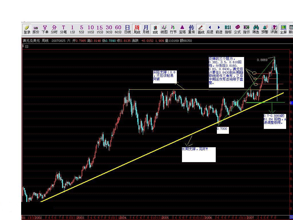 在昨天时澳元出现振荡反弹的行情.在上周时澳元出现有史以来最大幅度的暴跌行情,跌幅达到800点,这周来则出现反弹,目前美国次级债的消息有所散去,而套息交息再度出现使澳元得以支持,从技术上看日线图看,澳元目前处于一个下行趋势,今天从KDJ指标在下方振荡向上,而RSI指标势则有继续向上调整的要求,再从4小时图上看KDJ指标在上方振荡向上.从以上分析看来上方阻力0. 8220下方支持在0.8060,今天的操作可以逢低买入,穿0.8060止损或暂时观望等待时机根据市场走势决定