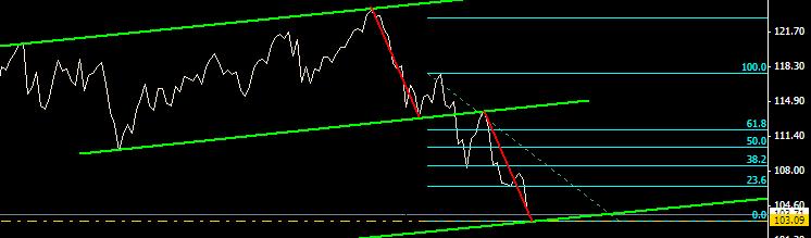 按道氏的收盘分析,103附近应该是美日自124起跌后的c(e)浪低点,后市走反弹大约可以到108.5(即108中档附近)