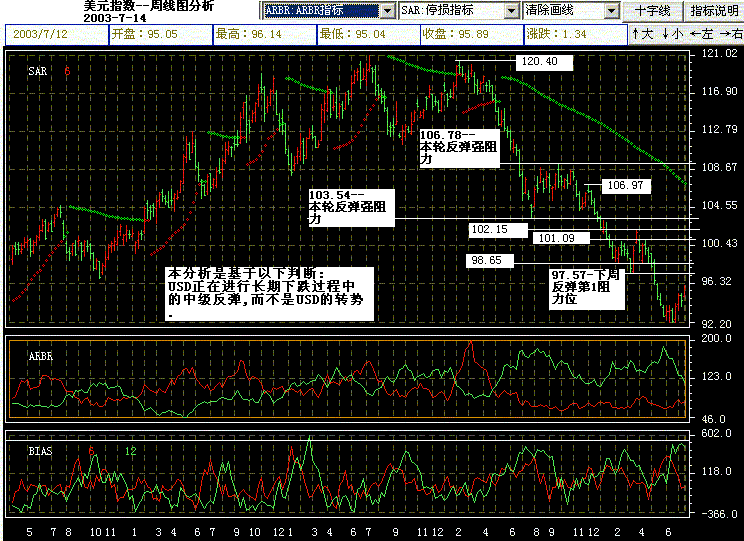 Originally posted by SUNJUAN at 2003-7-17 10:46 PM: 同意,从美圆指数看,最高昨天到了97.45--这是我预计的美圆中级反弹的第一阻力位, 从今天盘面看,晚8:30来了个快速下探,应该是美圆对阻力位的确认. 估计美圆将下跌几天,以修正各项技术指标.
