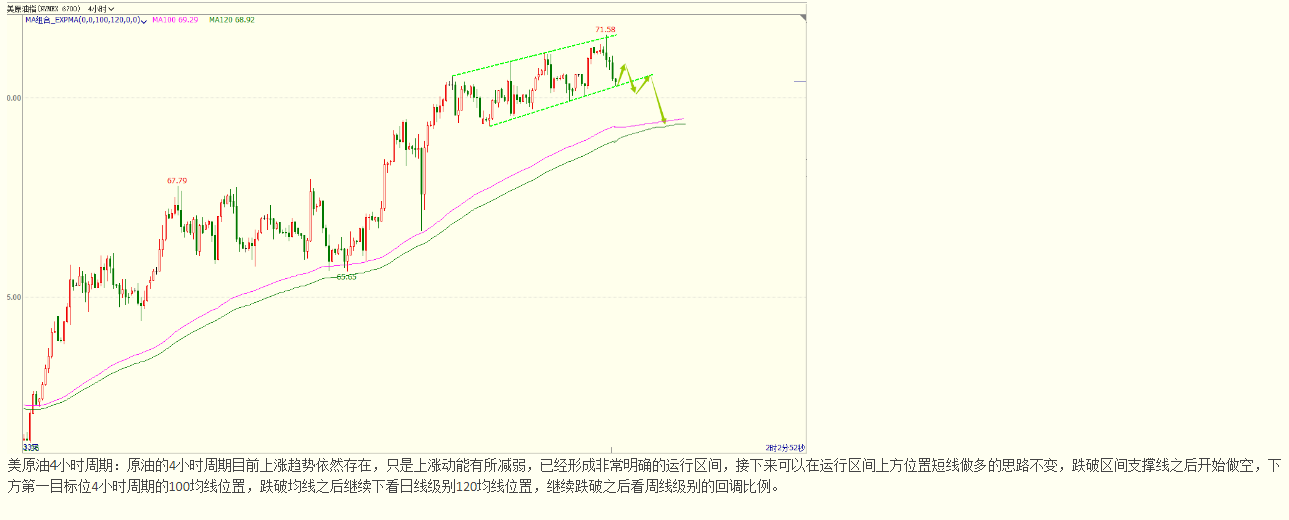 原油方面的走势分析,在当时的原油先71.5做空至64,然后66做多持有到现在,当时的具体分析如下: