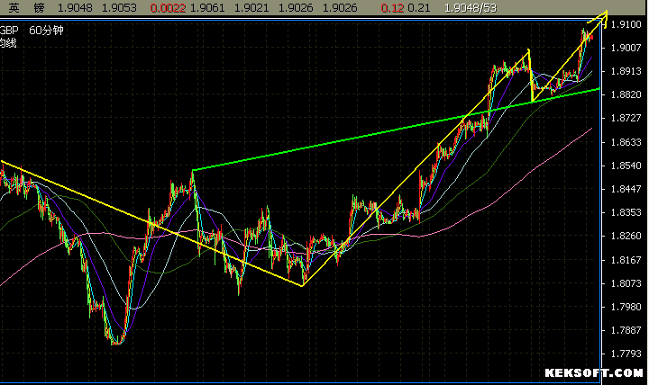 短线来看,五浪4调整至上周可能已经结束,目前处于新一轮五浪5上升走势中,其中五浪4A浪1.2898-1.2330运行568点刚好回落至1.1373-1.2898的0.382处,自始展开五浪4的B浪反弹(1.2330-1.2775运行445点),C浪为1.2775-1.2347运行428点。周五欧元大幅冲高随后又大幅回落,走势较为复杂,本周初预计继续调整(低位震荡为主),后期有望再度上行目标1.2900。