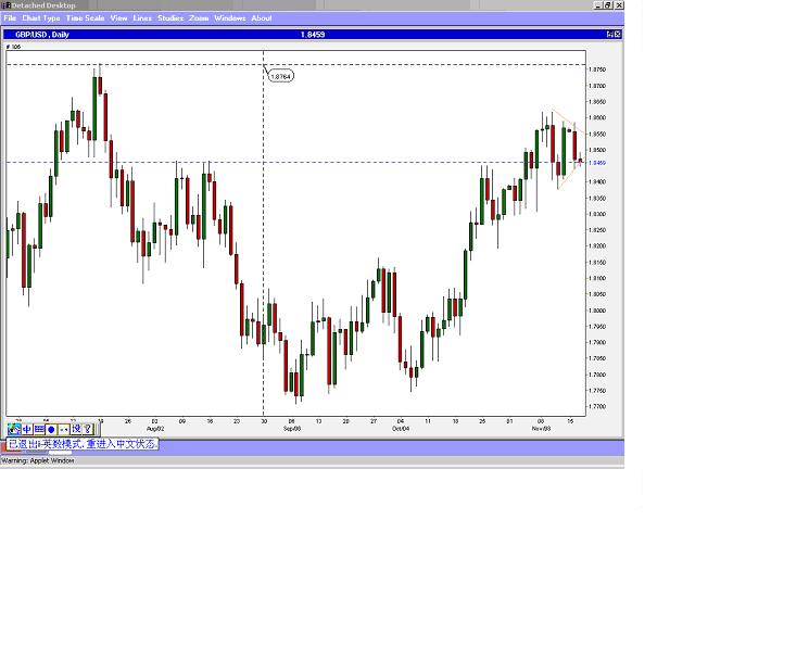英镑/美元上周最高上冲1.8615, 未达到1.8650-1.8670区间. 形态上正进行三角形整理,若跌破1.8420, 则下望1.8260,( 目前可能性不大); 若冲破1.8590则上望1.8750. 形态上,似乎向上冲破的可能性更大。