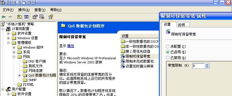 在“开始→运行”中输入gpedit.msc,打开组策略编辑器。找到“计算机配置→管理模板→网络→QoS数据包调度程序”,选择右边的“限制可保留带宽”,选择“属性”打开限制可保留带宽属性对话框,选择“启用”,并将原来的“20”改为“0”,这样就释放了保留的带宽。